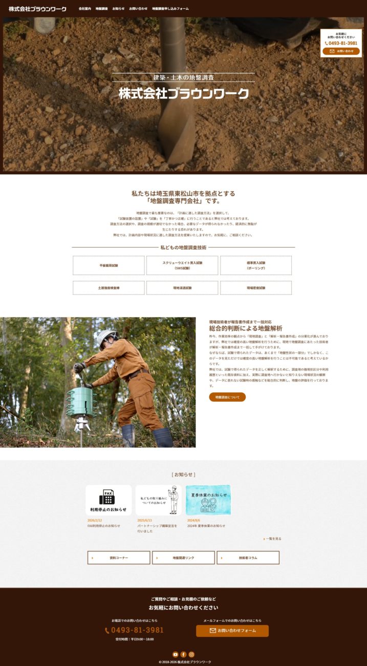 埼玉県東松山市にある地盤調査会社 ブラウンワークさまのホームページを制作させていただきました。